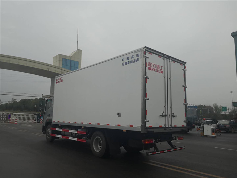 黃色型號為危化專用型號配置增加前盤剎車,排氣管前置,限速80裝置,帶排氣制動。QL1042A5HAY,QL1071A5KAY,QL1043A5HAY,QL1072A5KAY,QL1070A5KWY這五個型號可加3500元選裝斷氣剎。廂體制作工藝斷橋隔熱, 保溫隔熱 防火阻燃,廂體內外采用玻璃鋼,保溫材質聚氨酯復合材料,底板通風槽采用鋁合金板材。發動機凈功率為95kW,發動機型號4KH1CN5HD,油耗值為12.4L/100km。該車頂部封閉,不可開啟。側防護材料:鋼板 Q235,連接方式:用螺栓連接在車廂橫梁上;后防護支架以螺栓連接在車架縱梁尾端,后防護斷面尺寸:105×(45~140)(mm),離地高度:490mm。