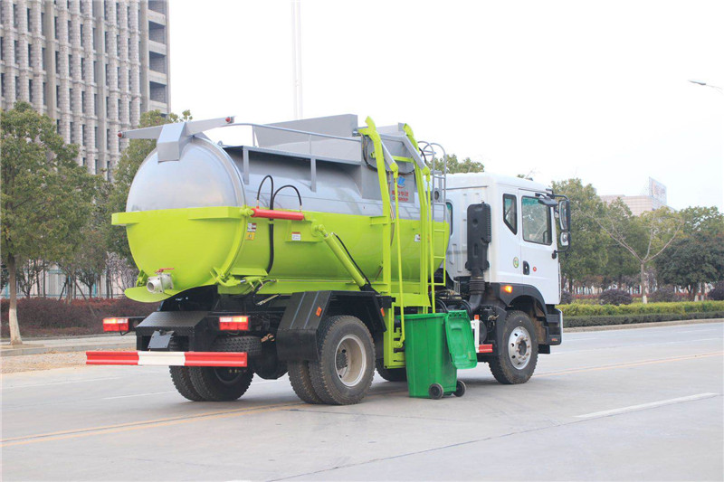 該車可選配后掛桶翻轉機構、后擺臂翻轉機構、垃圾斗翻轉機構。后掛桶翻轉機構可掛120升、240升、330升、660升垃圾桶,后擺臂翻轉機構,可翻轉2至4方垃圾斗,垃圾斗翻轉機構主要用于垃圾收集、翻轉、密封,垃圾收集完畢以后垃圾斗起到對后尾部密封的作用,防止造成二次污染。底盤配置東風天龍平頂排半白色駕駛室,4350+1350軸距,可裝18/20立方垃圾。國六康機290/雷諾300馬力發動機,東風7檔/法士特9檔變速箱,5.5噸前橋。