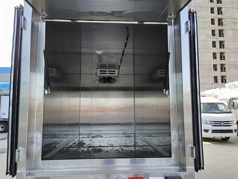 廂體配置:廂體材料纖維板,中間聚氨酯保溫板,內(nèi)板不銹鋼,全車不銹鋼鎖件,右側(cè)選裝單側(cè)門,廂體內(nèi)裝紫外線燈,自動(dòng)噴霧消毒,下面接污水處理箱,尾部門中門,配零下5度制冷機(jī)。